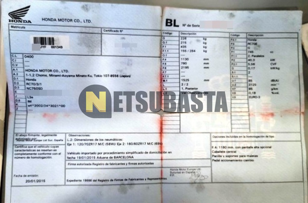 Subasta de Honda NC 750 S DCT 2017 Averiados, Marca Honda, Modelo NC 750 S DCT, Combustible Gasolina, Kilometraje 90.000 KM, Fecha 1ª matriculación 04/2017, Matrícula ****JYF, Color Exterior , Color Interior , IVA REBU y Ubicación Madrid.