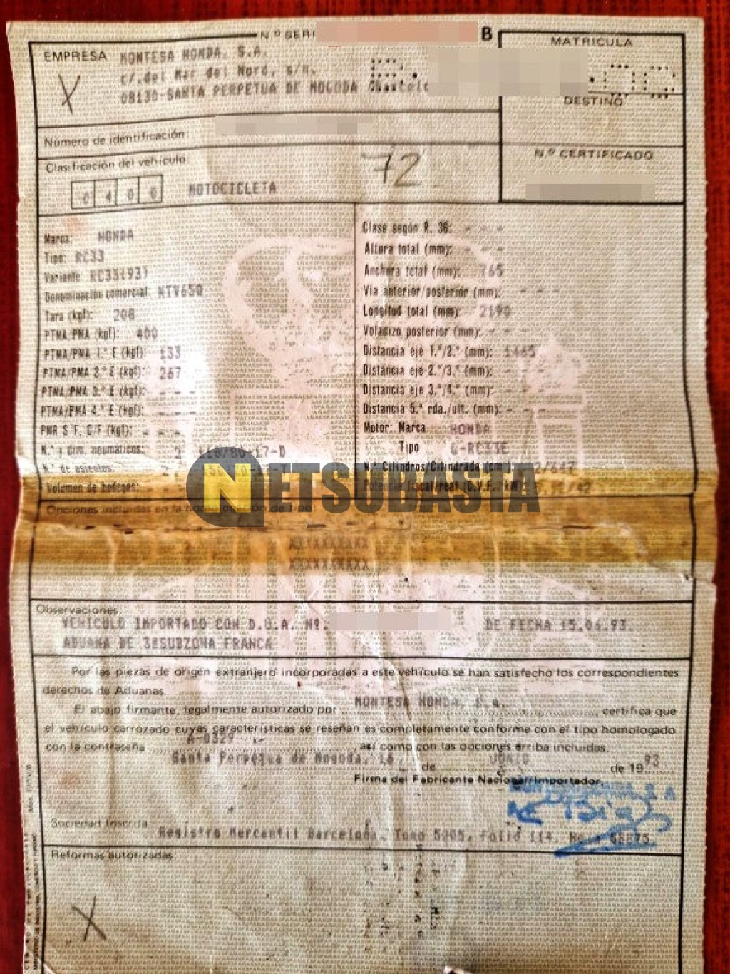 Subasta de Honda NTV 650 REVERE 1993 Averiados, Marca Honda, Modelo NTV 650 REVERE, Combustible Gasolina, Kilometraje 112.000 KM, Fecha 1ª matriculación 07/1993, Matrícula B****OG, Color Exterior , Color Interior , IVA REBU y Ubicación Barcelona.
