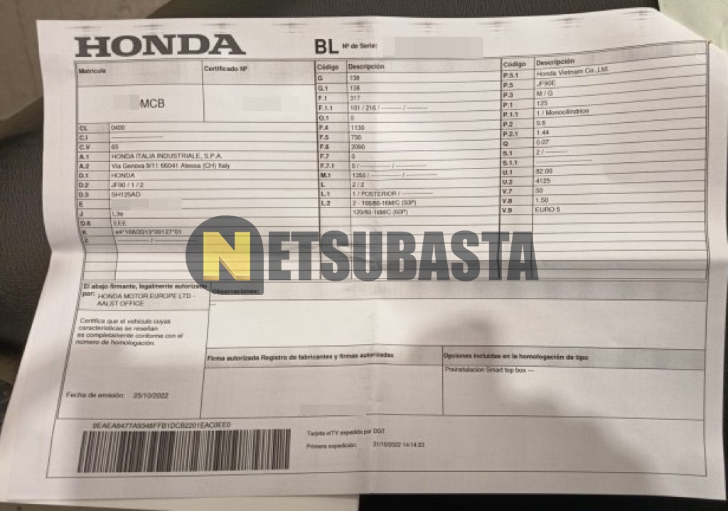 Subasta de Honda SH 125 ABS 2022 Siniestrados, Marca Honda, Modelo SH 125 ABS, Combustible Gasolina, Kilometraje 40.000 KM, Fecha 1ª matriculación 10/2022, Matrícula ****MCB, Color Exterior , Color Interior , IVA REBU y Ubicación Vizcaya.