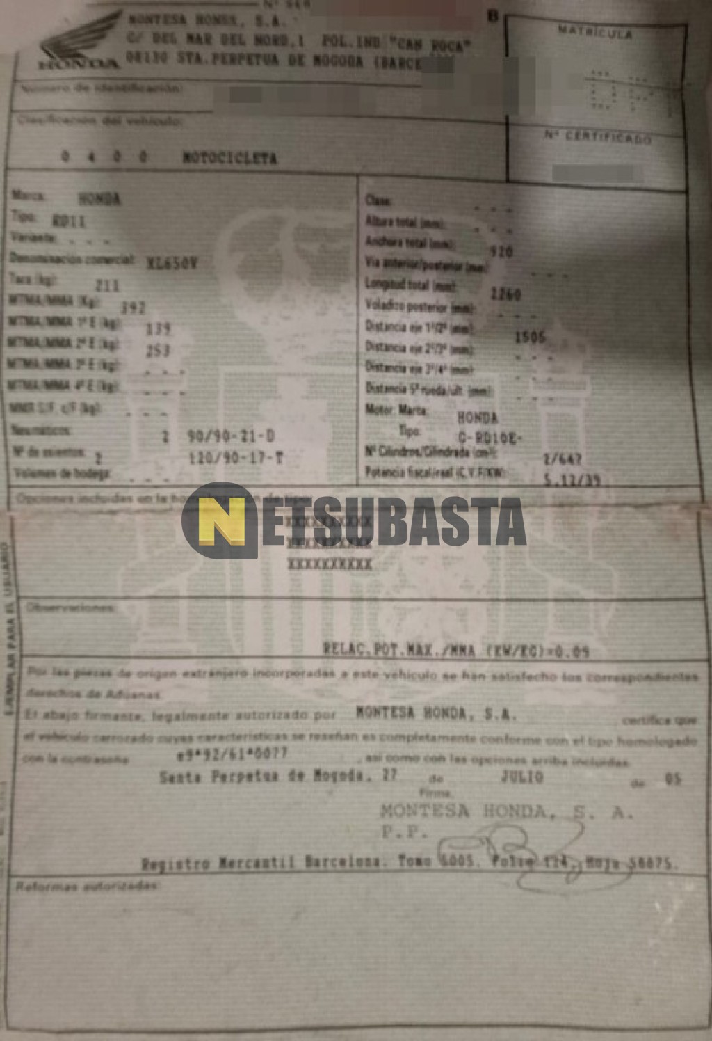 Recuerde que si lo desea, puede imprimir la ficha del vehículo Honda Transalp XL 650 V 2005 con todas sus características técnicas.