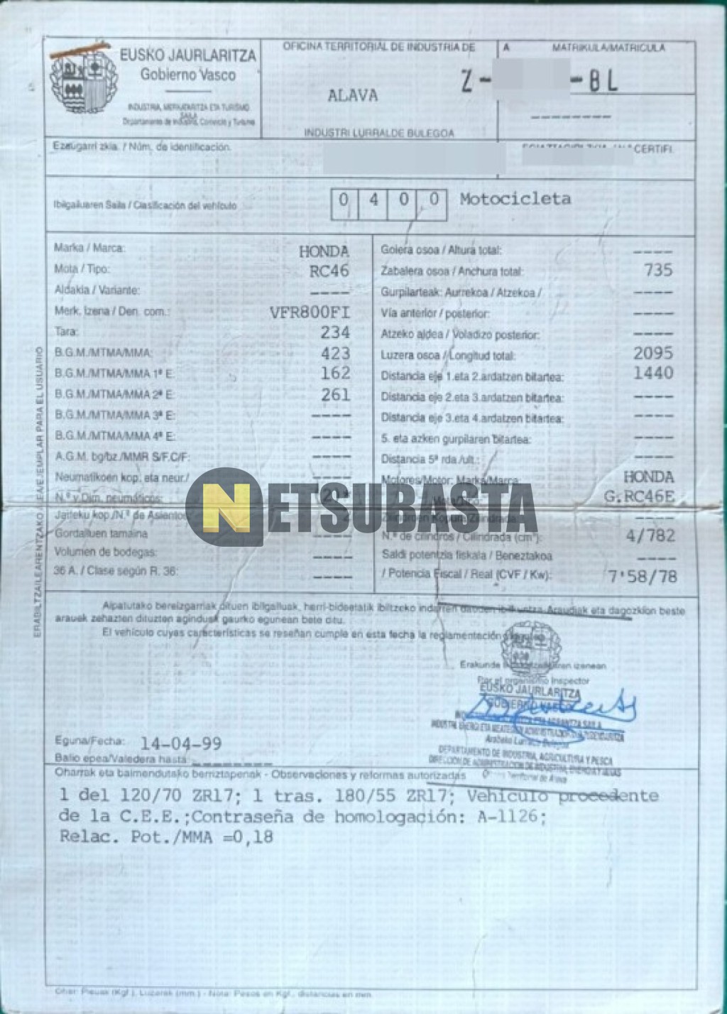 Subasta de Honda VFR 800 FI 1999 Averiados, Marca Honda, Modelo VFR 800 FI, Combustible Gasolina, Kilometraje 155.000 KM, Fecha 1ª matriculación 04/1999, Matrícula Z****BL, Color Exterior , Color Interior , IVA REBU y Ubicación Madrid.