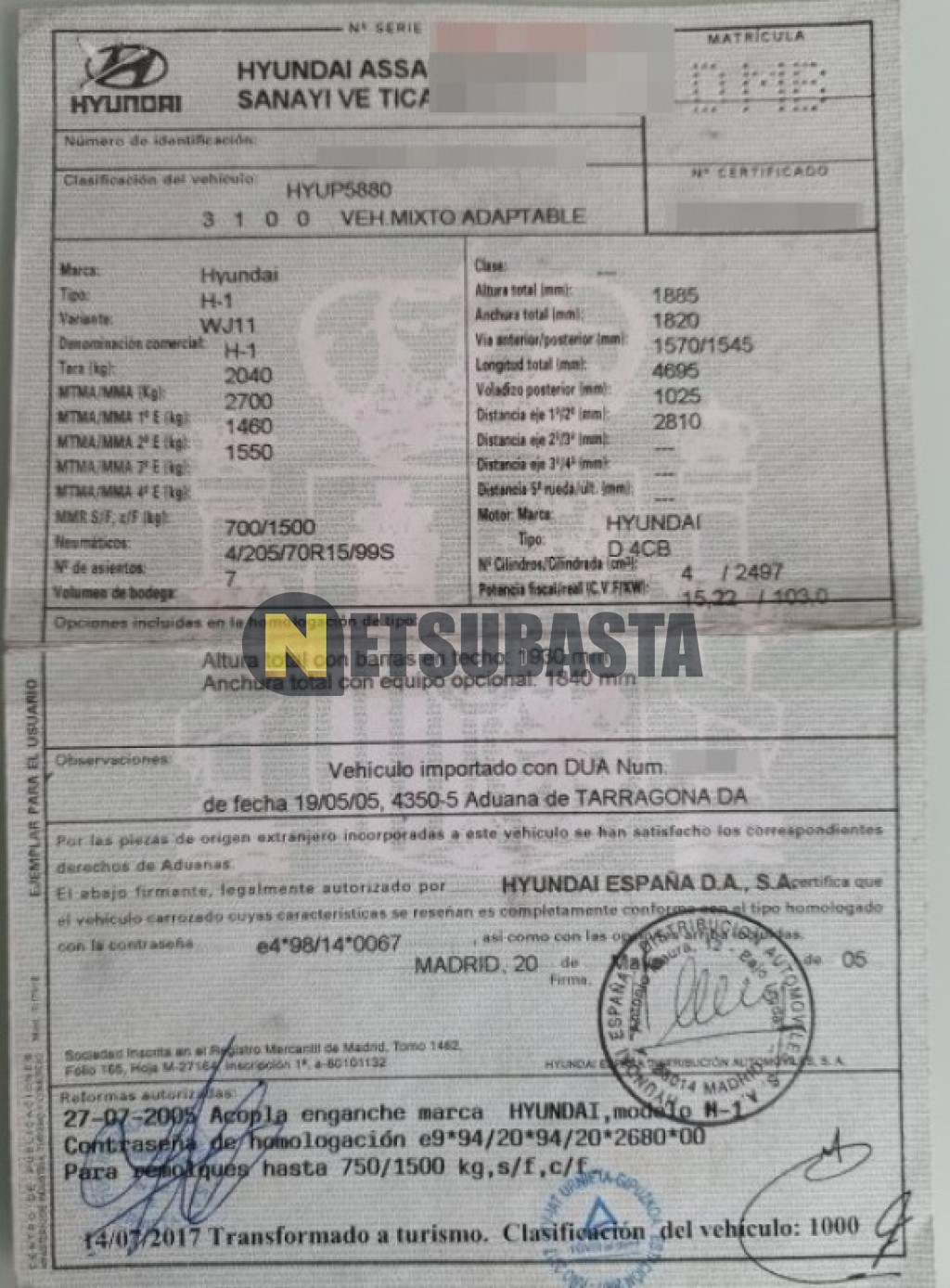 Subasta de Hyundai H-1 2.5 CRDi 2005 Averiados, Marca Hyundai, Modelo H-1 2.5 CRDi, Combustible Diésel, Kilometraje 193.000 KM, Fecha 1ª matriculación 06/2005, Matrícula ****DMB, Color Exterior , Color Interior , IVA REBU y Ubicación Álava.