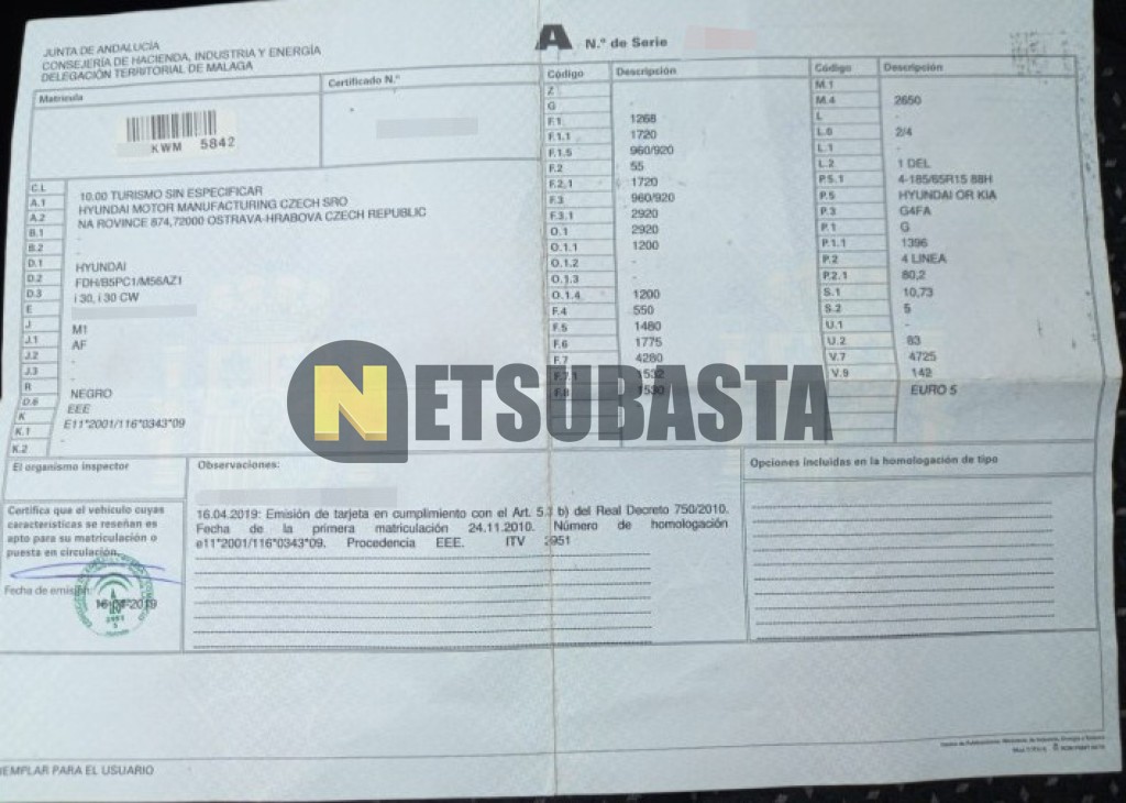 Subasta de Hyundai i30 1.4 2010 Siniestrados, Marca Hyundai, Modelo i30 1.4 , Combustible Gasolina, Kilometraje 147.000 KM, Fecha 1ª matriculación 11/2010, Matrícula ****KWM, Color Exterior , Color Interior , IVA REBU y Ubicación Málaga.
