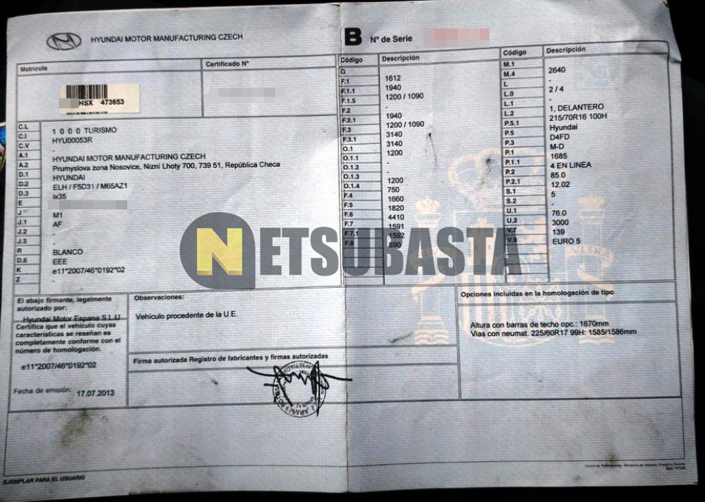 Subasta de Hyundai ix35 1.7 CRDi 4x2 2013 Averiados, Marca Hyundai, Modelo ix35 1.7 CRDi 4x2, Combustible Diésel, Kilometraje 225.000 KM, Fecha 1ª matriculación 09/2013, Matrícula ****HSX, Color Exterior , Color Interior , IVA REBU y Ubicación Madrid.