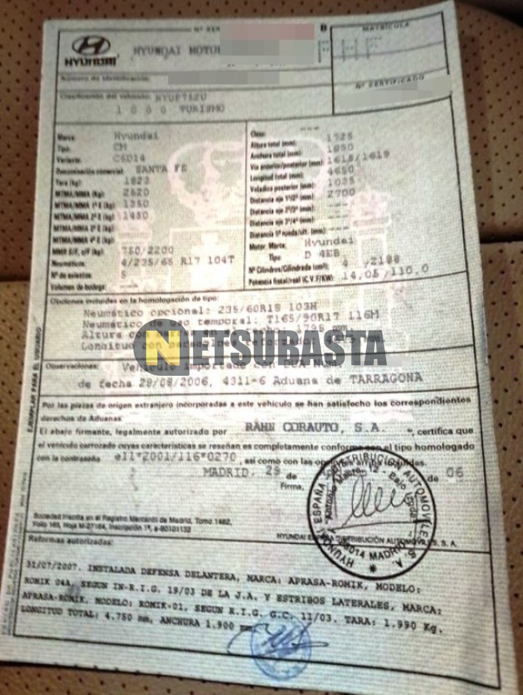 Subasta de Hyundai Santa Fe 2.2 VGT 2006 Averiados, Marca Hyundai, Modelo Santa Fe 2.2 VGT , Combustible Diésel, Kilometraje 305.000 KM, Fecha 1ª matriculación 11/2006, Matrícula ****FHF, Color Exterior , Color Interior , IVA REBU y Ubicación Madrid.