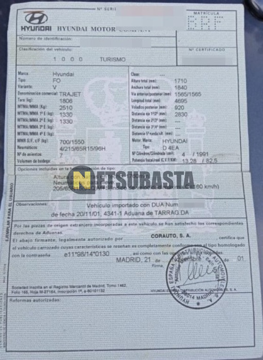 Subasta de Hyundai Trajet 2.0 GLS CRDi 2001 Averiados, Marca Hyundai, Modelo Trajet 2.0 GLS CRDi, Combustible Diésel, Kilometraje 130.000 KM, Fecha 1ª matriculación 12/2001, Matrícula ****BRF, Color Exterior , Color Interior , IVA REBU y Ubicación Madrid.