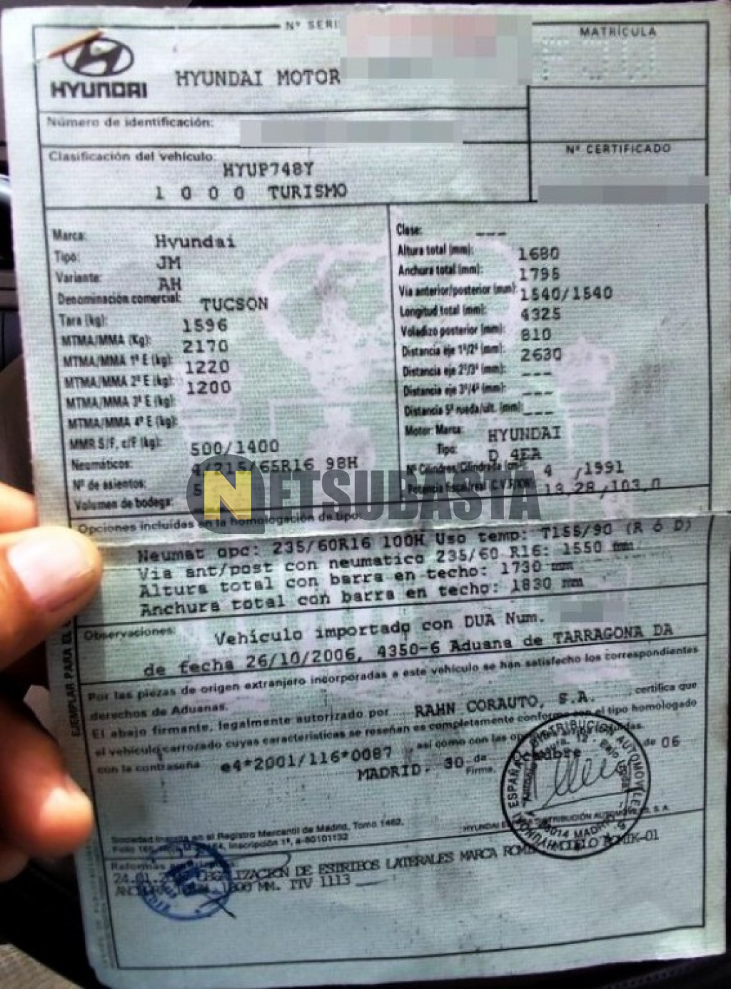 Subasta de Hyundai Tucson 2.0 CRDi VGT 4x2 2006 Averiados, Marca Hyundai, Modelo Tucson 2.0 CRDi VGT 4x2, Combustible Diésel, Kilometraje 193.000 KM, Fecha 1ª matriculación 12/2006, Matrícula ****FJW, Color Exterior , Color Interior , IVA REBU y Ubicación Cádiz.