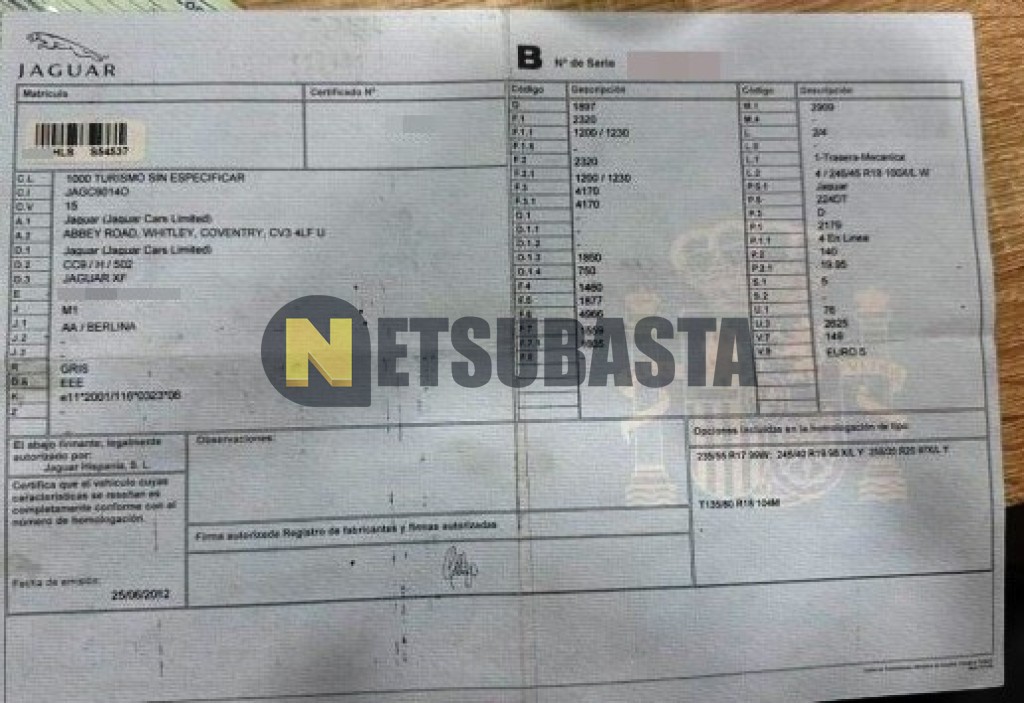 Subasta de Jaguar XF 2.2 Diesel 2012 Siniestrados, Marca Jaguar, Modelo XF 2.2 Diesel, Combustible Diésel, Kilometraje 145.000 KM, Fecha 1ª matriculación 07/2012, Matrícula ****HLS, Color Exterior , Color Interior , IVA REBU y Ubicación Huelva.