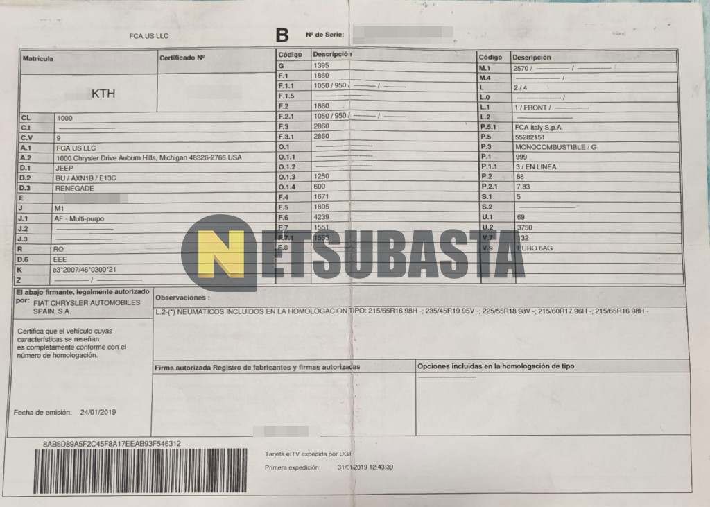 Subasta de Jeep Renegade 1.0 Turbo 2019 Averiados, Marca Jeep, Modelo Renegade 1.0 Turbo, Combustible Gasolina, Kilometraje 114.000 KM, Fecha 1ª matriculación 01/2019, Matrícula ****KTH, Color Exterior , Color Interior , IVA REBU y Ubicación Alicante.