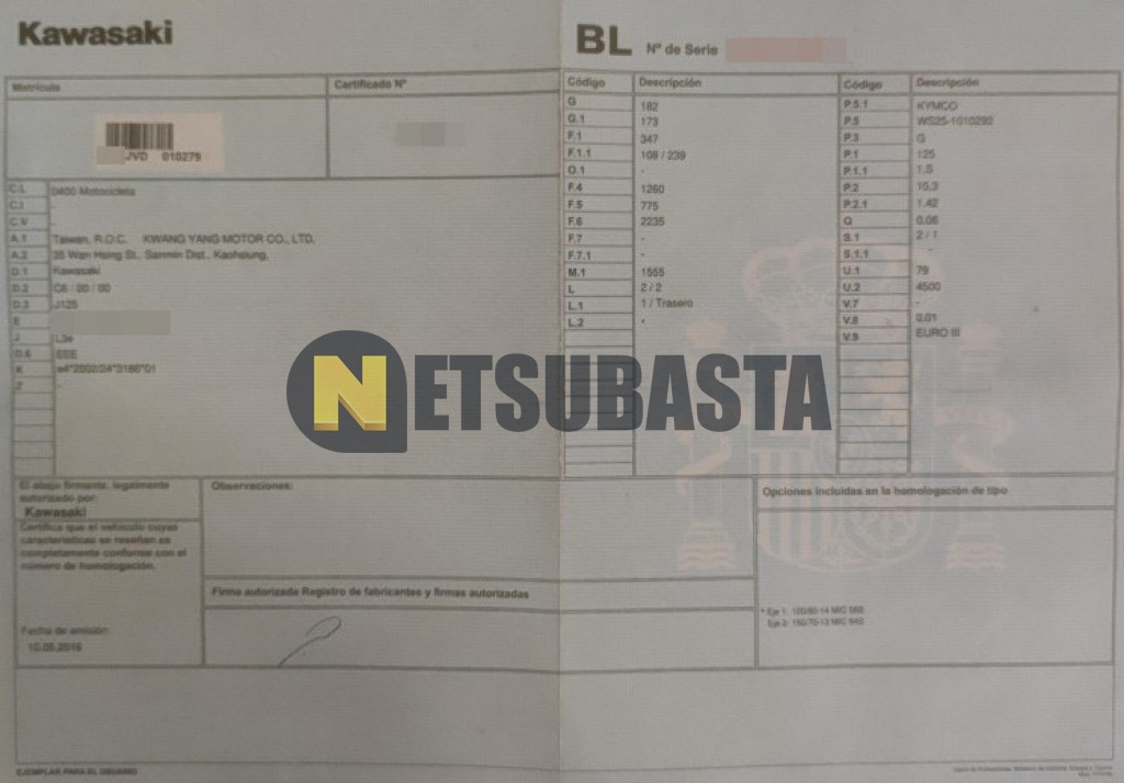 Subasta de Kawasaki J 125 2016 Siniestrados, Marca Kawasaki, Modelo J 125, Combustible Gasolina, Kilometraje 41.000 KM, Fecha 1ª matriculación 11/2016, Matrícula ****JVD, Color Exterior , Color Interior , IVA REBU y Ubicación Madrid.