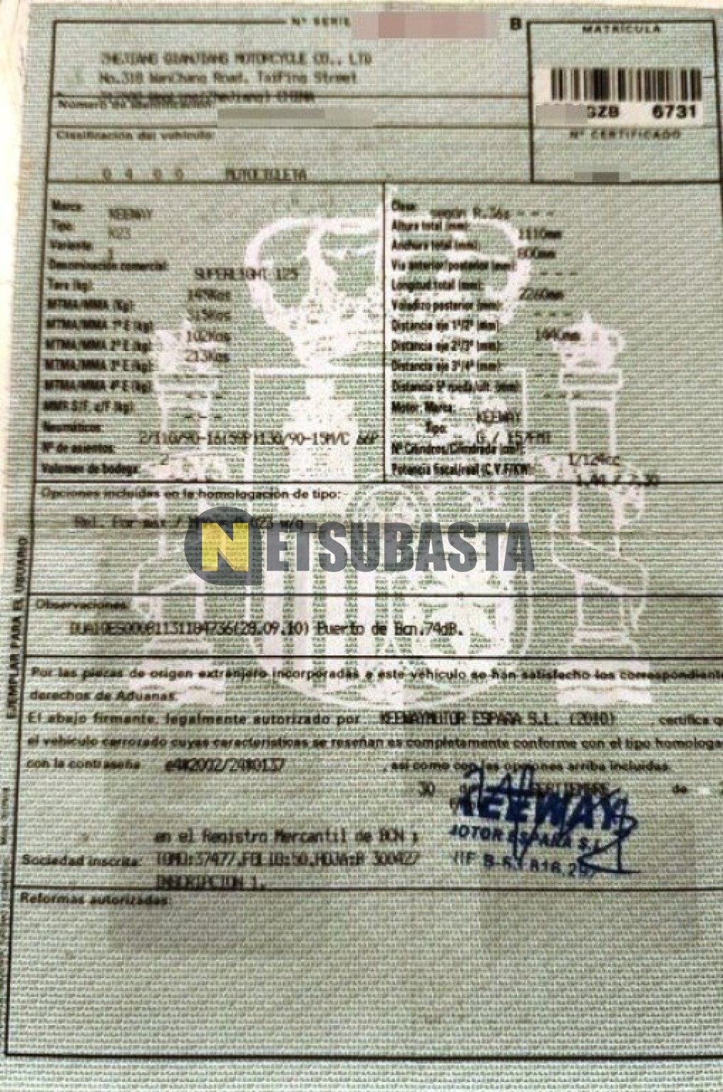 Subasta de Keeway Superligth 125 2010 Averiados, Marca Keeway, Modelo Superligth 125, Combustible Gasolina, Kilometraje 36.000 KM, Fecha 1ª matriculación 10/2010, Matrícula ****GZB, Color Exterior , Color Interior , IVA REBU y Ubicación Castellón.
