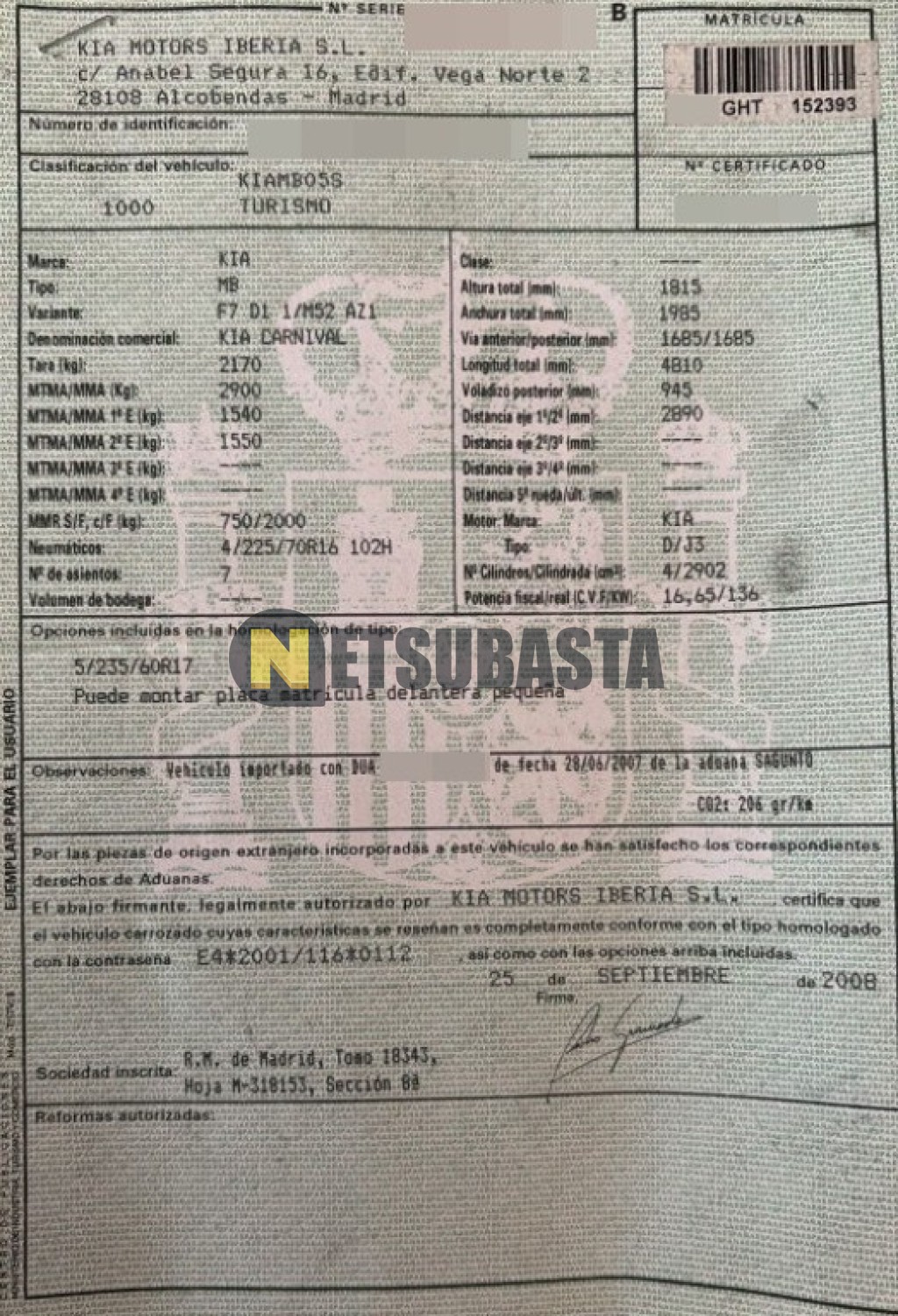Subasta de Kia Carnival 2.9 CRDi VGT 2008 Averiados, Marca Kia, Modelo Carnival 2.9 CRDi VGT, Combustible Diésel, Kilometraje 180.000 KM, Fecha 1ª matriculación 09/2008, Matrícula ****GHT, Color Exterior , Color Interior , IVA REBU y Ubicación Madrid.