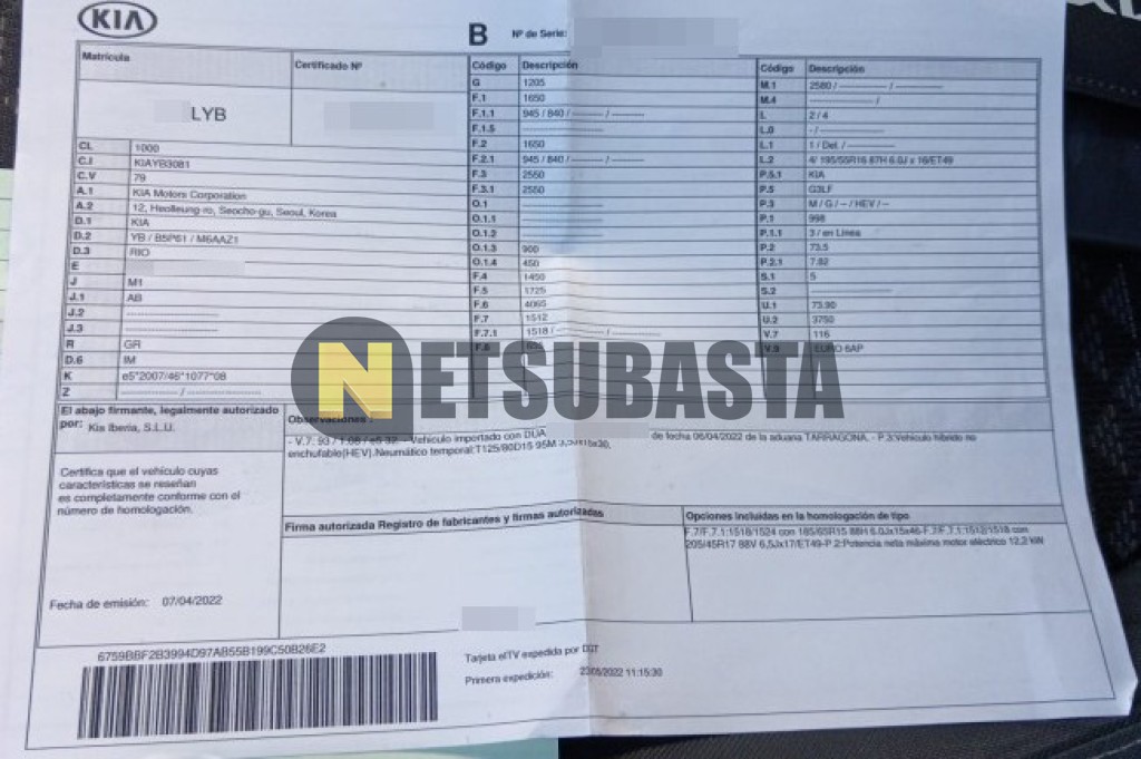 Subasta de Kia Rio 1.0 T-GDi MHEV 2022 Siniestrados, Marca Kia, Modelo Rio 1.0 T-GDi MHEV, Combustible Gasolina, Kilometraje 85.000 KM, Fecha 1ª matriculación 05/2022, Matrícula ****LYB, Color Exterior , Color Interior , IVA REBU y Ubicación Alicante.