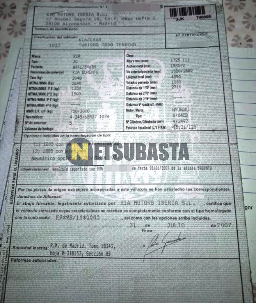 Subasta de Kia Sorento 2.5 CRDi 2008 Averiados, Marca Kia, Modelo Sorento 2.5 CRDi, Combustible Diésel, Kilometraje 235.000 KM, Fecha 1ª matriculación 11/2008, Matrícula ****GJK, Color Exterior , Color Interior , IVA REBU y Ubicación Madrid.