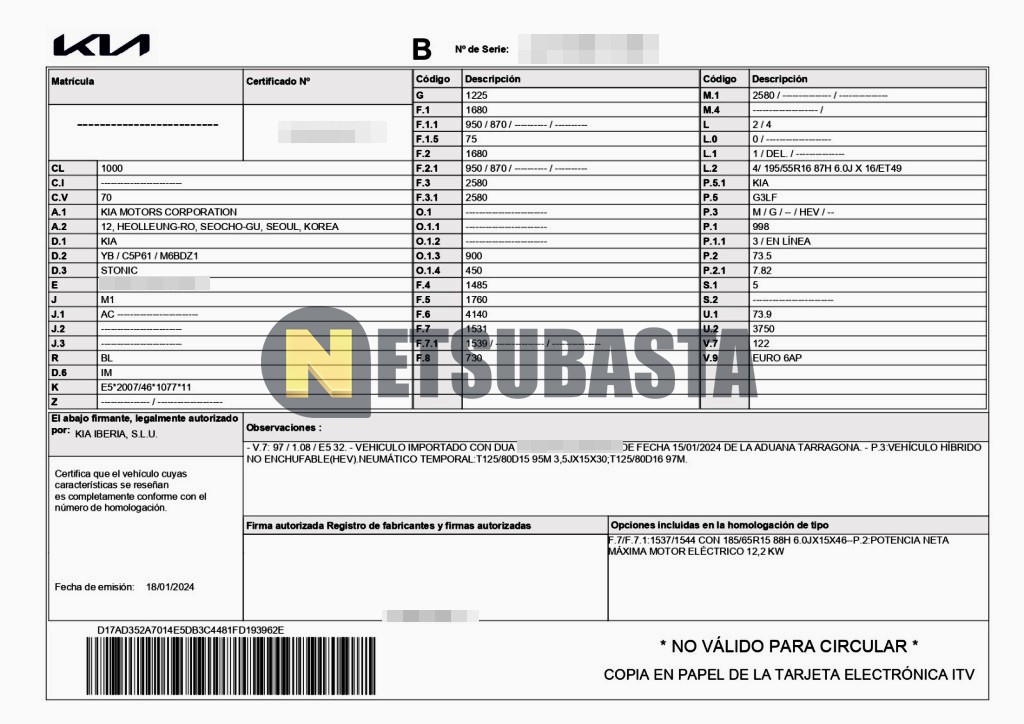 Subasta de Kia Stonic 1.0 T-GDi MHEV iMT 2024 Siniestrados, Marca Kia, Modelo Stonic 1.0 T-GDi MHEV iMT, Combustible Gasolina, Kilometraje 35.000 KM, Fecha 1ª matriculación 02/2024, Matrícula ****MND, Color Exterior , Color Interior , IVA REBU y Ubicación Madrid.