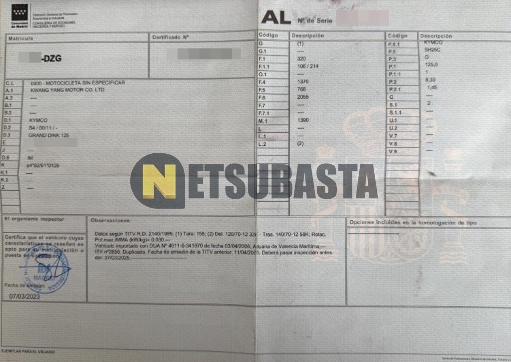 Subasta de Kymco Grand Dink 125 2006 Averiados, Marca Kymco, Modelo Grand Dink 125, Combustible Gasolina, Kilometraje 70.000 KM, Fecha 1ª matriculación 05/2006, Matrícula ****DZG, Color Exterior , Color Interior , IVA REBU y Ubicación Madrid.