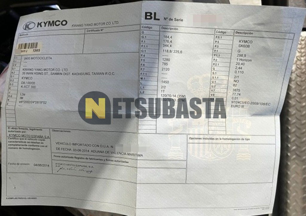 Subasta de Kymco K XCT 300i 2014 Averiados, Marca Kymco, Modelo K XCT 300i, Combustible Gasolina, Kilometraje 100.000 KM, Fecha 1ª matriculación 07/2014, Matrícula ****HYJ, Color Exterior , Color Interior , IVA REBU y Ubicación Barcelona.