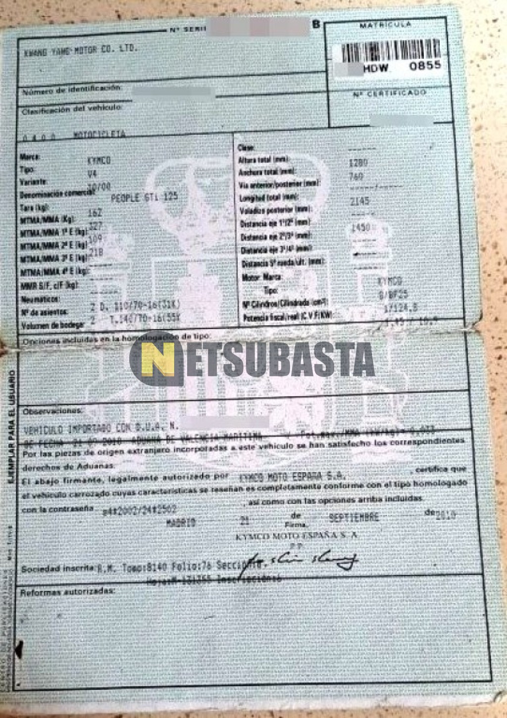 Subasta de Kymco People 125 GTi 2011 Averiados, Marca Kymco, Modelo People 125 GTi, Combustible Gasolina, Kilometraje 55.000 KM, Fecha 1ª matriculación 06/2011, Matrícula ****HDW, Color Exterior , Color Interior , IVA REBU y Ubicación Barcelona.