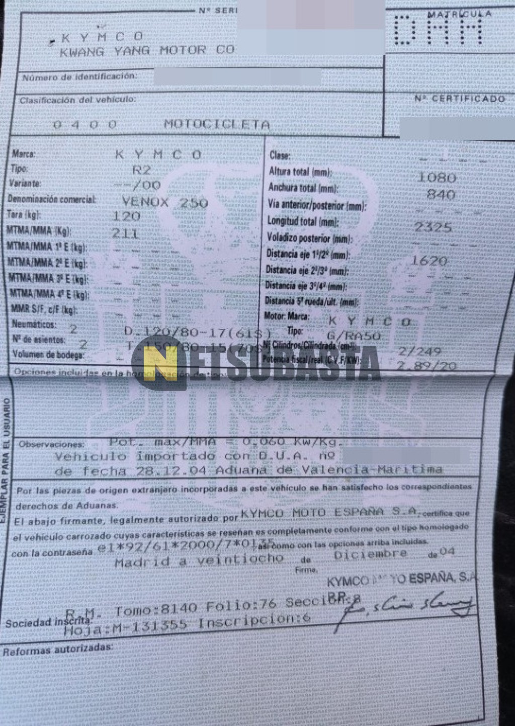 Subasta de Kymco Venox 250 2005 Averiados, Marca Kymco, Modelo Venox 250, Combustible Gasolina, Kilometraje 25.000 KM , Fecha 1ª matriculación 03/2005, Matrícula ****DHH, Color Exterior , Color Interior , IVA REBU y Ubicación Madrid.
