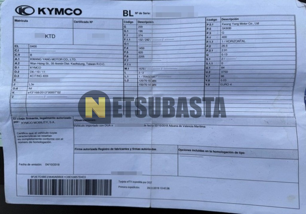 Subasta de Kymco Xciting 400 i 2019 Siniestrados, Marca Kymco, Modelo Xciting 400 i, Combustible Gasolina, Kilometraje 52.000 KM, Fecha 1ª matriculación 01/2019, Matrícula ****KTD, Color Exterior , Color Interior , IVA REBU y Ubicación Barcelona.