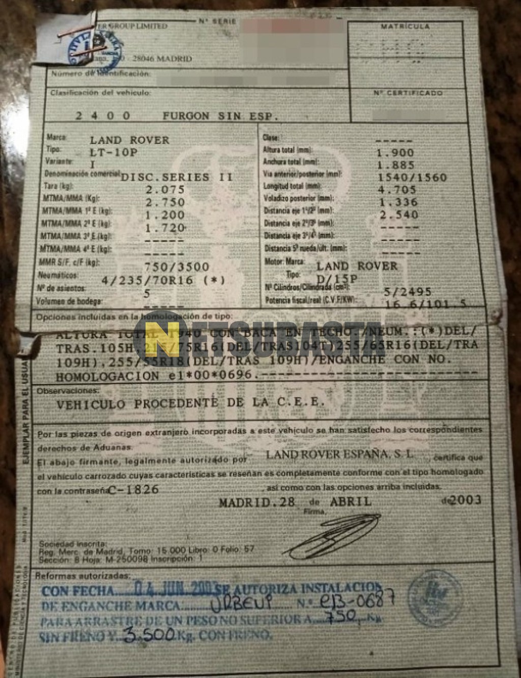 Subasta de Land-Rover Discovery 2.5 Td5 2003 Averiados, Marca Land-Rover, Modelo Discovery 2.5 Td5, Combustible Diésel, Kilometraje 347.000 KM, Fecha 1ª matriculación 05/2003, Matrícula ****CHG, Color Exterior , Color Interior , IVA IVA Deducible y Ubicación Madrid.