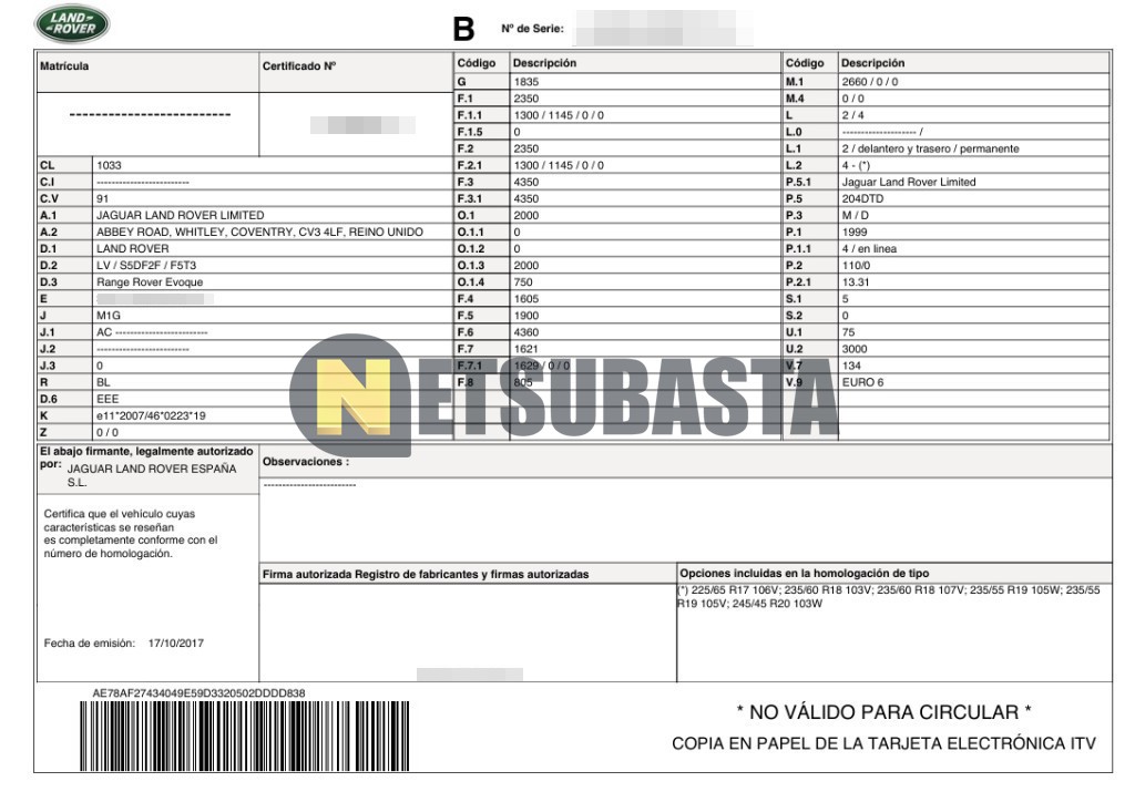 Subasta de Land-Rover Evoque 2.0 Td4 4x4 Auto 2017 Averiados, Marca Land-Rover, Modelo Evoque 2.0 Td4 4x4 Auto, Combustible Diésel, Kilometraje 119.000 KM, Fecha 1ª matriculación 12/2017, Matrícula ****KFZ, Color Exterior , Color Interior , IVA REBU y Ubicación Alicante.