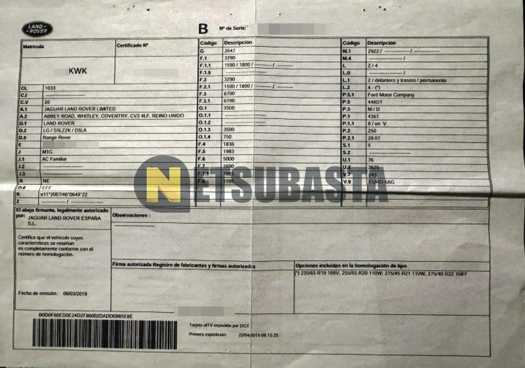 Subasta de Land-Rover Range Rover Sport 4.4 SDV8 Autobiography 2019 Averiados, Marca Land-Rover, Modelo Range Rover Sport 4.4 SDV8 Autobiography, Combustible Diésel, Kilometraje 140.000 KM, Fecha 1ª matriculación 04/2019, Matrícula ****KWK, Color Exterior , Color Interior , IVA IVA Deducible y Ubicación Ciudad Real.