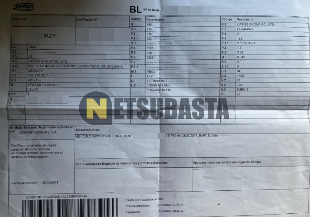 Subasta de Leonart Daytona 125 2019 Averiados, Marca Leonart , Modelo Daytona 125 , Combustible Gasolina, Kilometraje 7.000 KM, Fecha 1ª matriculación 09/2019, Matrícula ****KZY, Color Exterior , Color Interior , IVA REBU y Ubicación Valencia.
