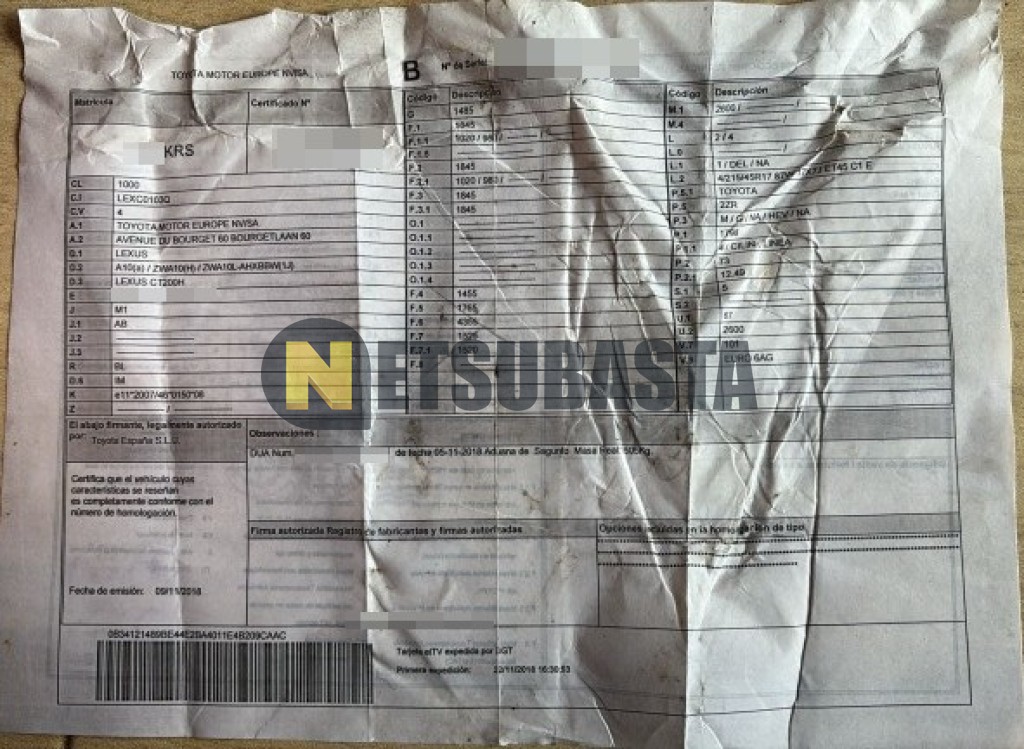 Subasta de Lexus CT 200h 2018 Siniestrados, Marca Lexus, Modelo CT 200h, Combustible Híbrido (Electro/Gasolina), Kilometraje DESCONOCIDO, Fecha 1ª matriculación 11/2018, Matrícula ****KRS, Color Exterior , Color Interior , IVA REBU y Ubicación Sevilla.