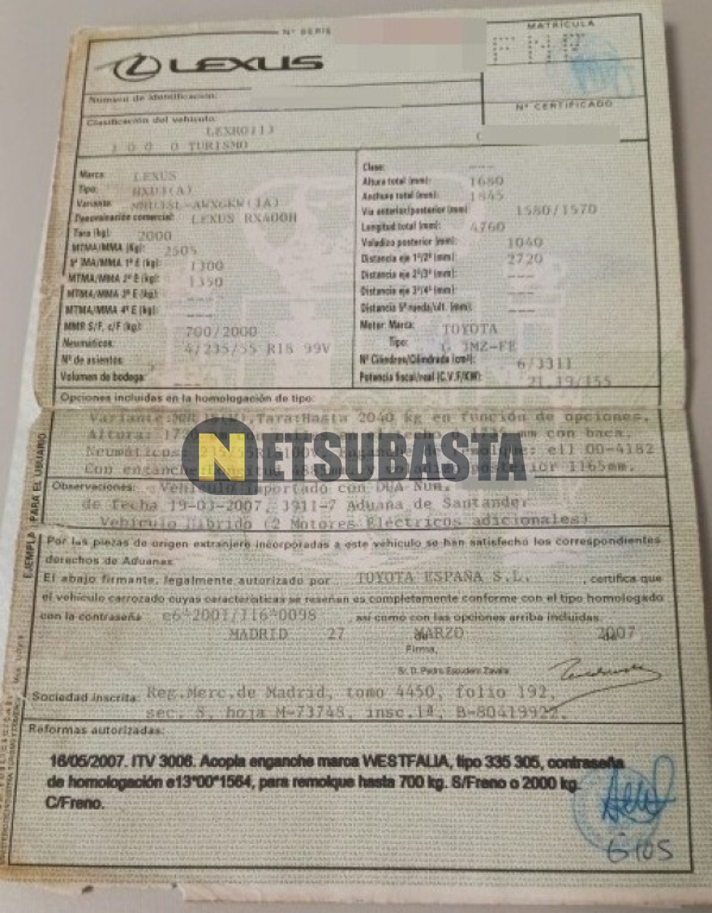 Subasta de Lexus RX 400h 2007 Averiados, Marca Lexus, Modelo RX 400h, Combustible Híbrido (Electro/Gasolina), Kilometraje 497.000 KM, Fecha 1ª matriculación 04/2007, Matrícula ****FNF, Color Exterior , Color Interior , IVA IVA Deducible y Ubicación Murcia.