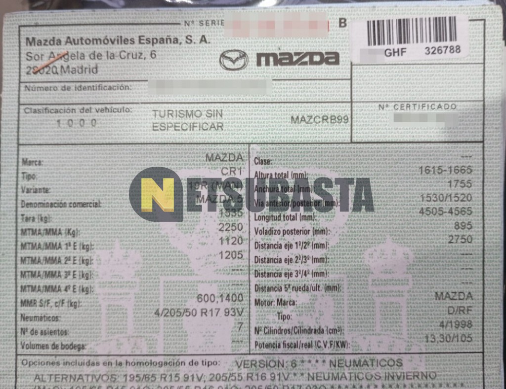 Subasta de Mazda 5 2.0 CRTD 2008 Siniestrados, Marca Mazda, Modelo 5 2.0 CRTD, Combustible Diésel, Kilometraje 110.000 KM, Fecha 1ª matriculación 08/2008, Matrícula ****GHF, Color Exterior , Color Interior , IVA REBU y Ubicación Valladolid.