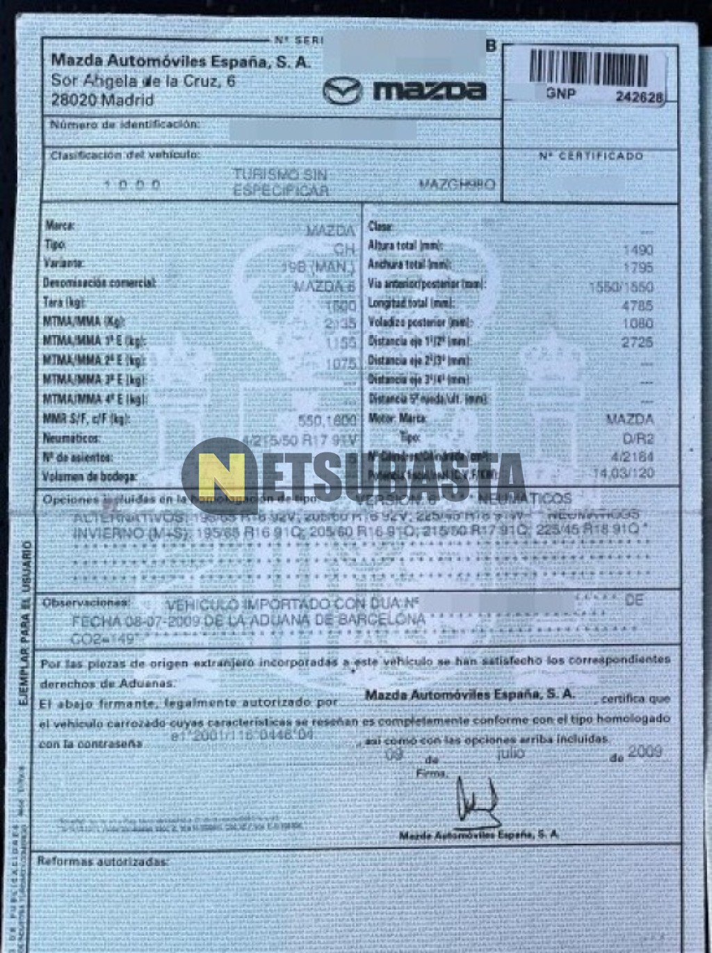 Subasta de Mazda 6 Wagon 2.2 2009 Averiados, Marca Mazda, Modelo 6 Wagon 2.2, Combustible Diésel, Kilometraje 270.000 KM, Fecha 1ª matriculación 07/2009, Matrícula ****GNP, Color Exterior , Color Interior , IVA REBU y Ubicación Vizcaya.