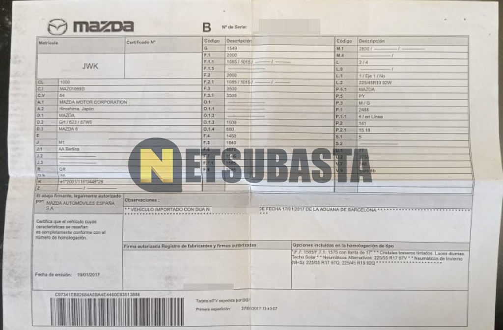Subasta de Mazda Mazda6 2.5 SKYACTIV-G Aut. 2017 Averiados, Marca Mazda, Modelo Mazda6 2.5 SKYACTIV-G Aut., Combustible Gasolina, Kilometraje 172.000 KM, Fecha 1ª matriculación 01/2017, Matrícula ****JWK, Color Exterior , Color Interior , IVA REBU y Ubicación Islas Baleares.