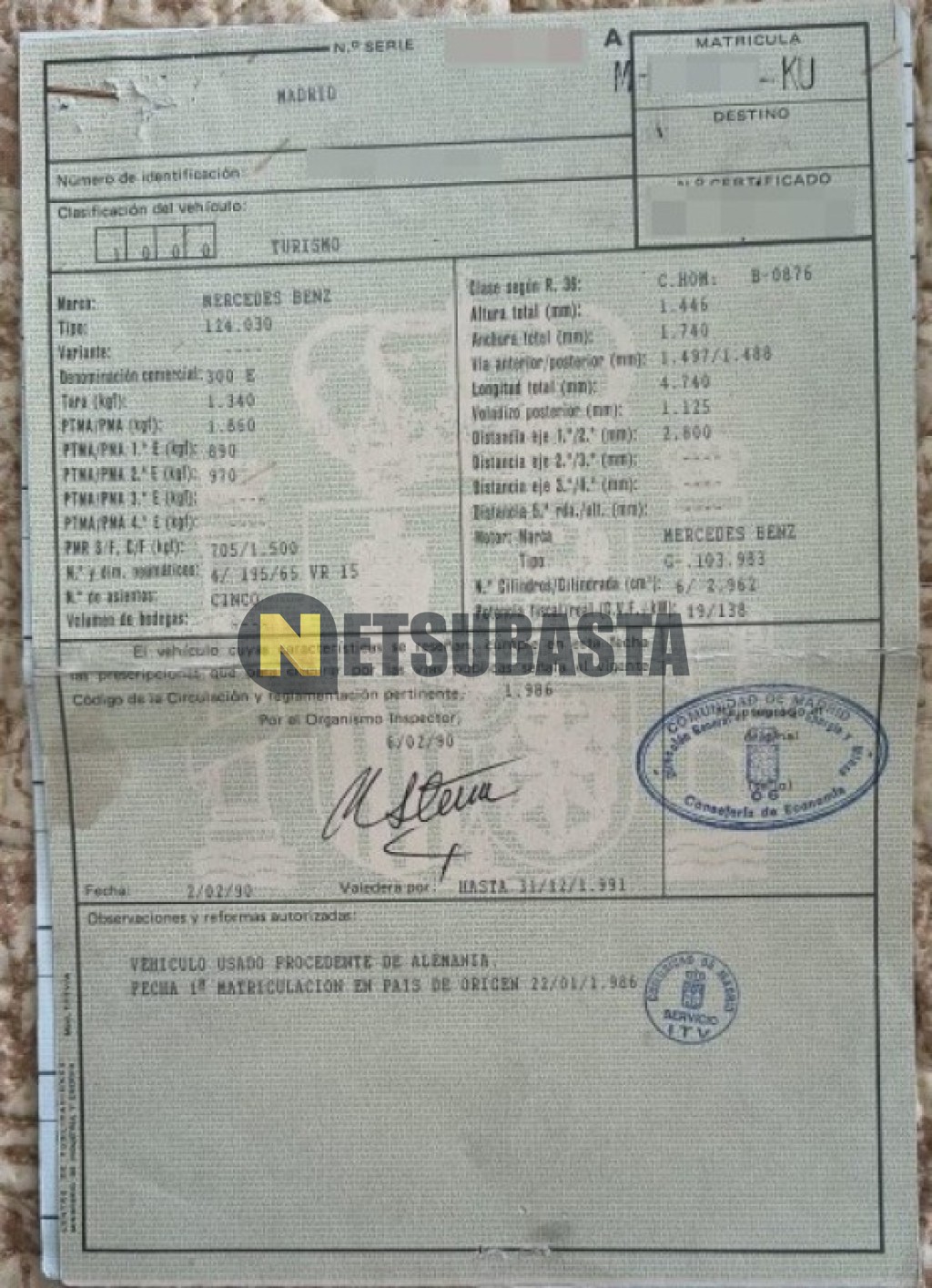 Subasta de Mercedes-Benz 300 E 1986 Averiados, Marca Mercedes-Benz, Modelo 300 E, Combustible Gasolina, Kilometraje 165.000 KM, Fecha 1ª matriculación 01/1986, Matrícula M****KU, Color Exterior , Color Interior , IVA REBU y Ubicación Madrid.