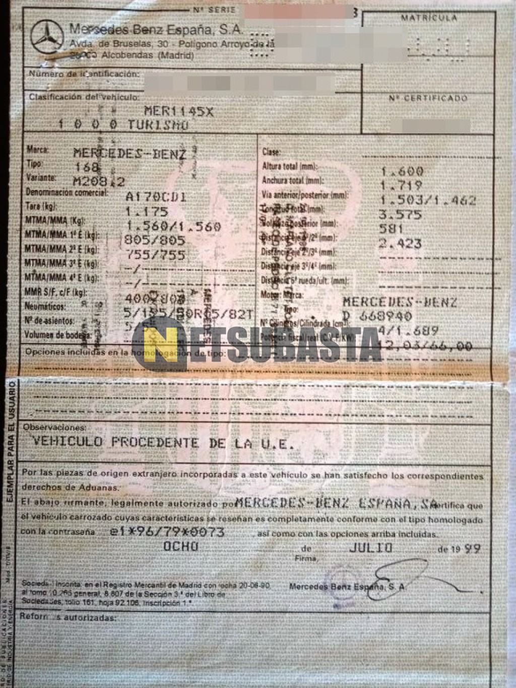 Subasta de Mercedes-Benz A 170 CDI 1999 Averiados, Marca Mercedes-Benz, Modelo A 170 CDI, Combustible Diésel, Kilometraje 250.000 KM, Fecha 1ª matriculación 07/1999, Matrícula B****VU, Color Exterior , Color Interior , IVA REBU y Ubicación Barcelona.