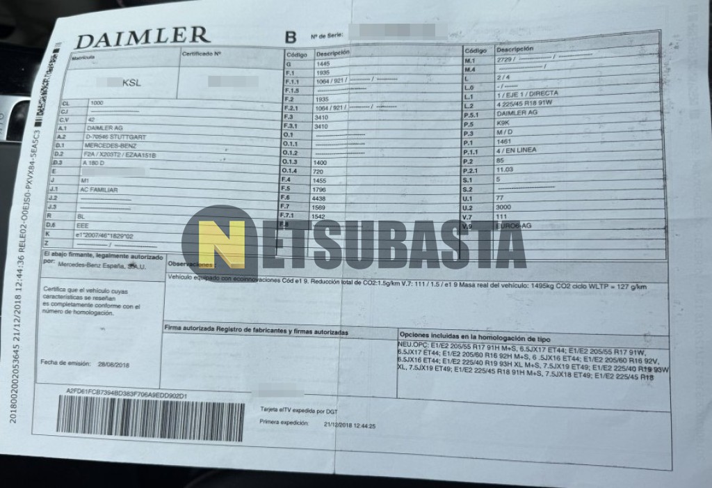 Subasta de Mercedes-Benz A 180 d 7G-DCT 2018 Siniestrados, Marca Mercedes-Benz, Modelo A 180 d 7G-DCT, Combustible Diésel, Kilometraje 256.000 KM , Fecha 1ª matriculación 12/2018, Matrícula ****KSL, Color Exterior , Color Interior , IVA REBU y Ubicación Cádiz.