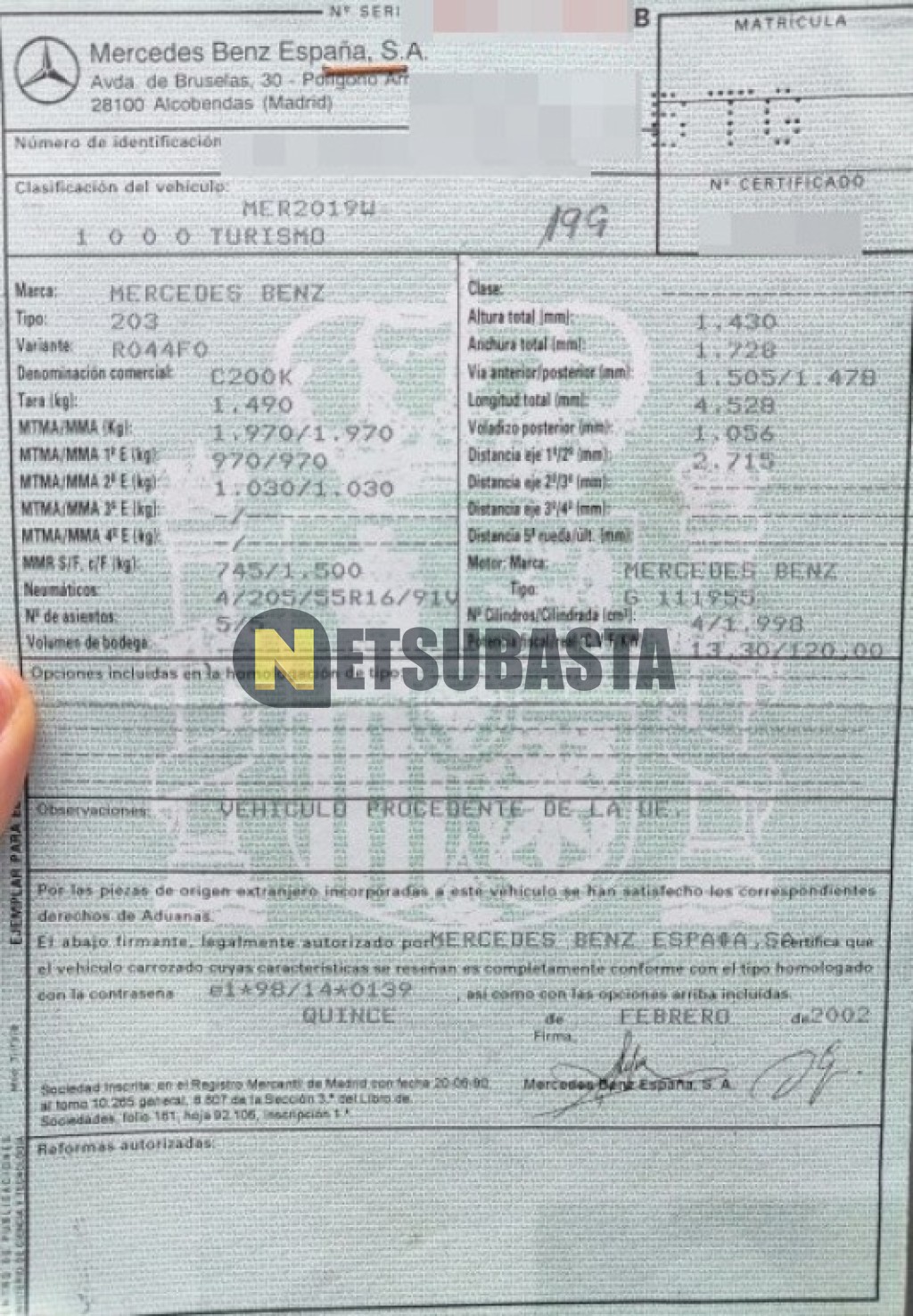 Recuerde que si lo desea, puede imprimir la ficha del vehículo Mercedes-Benz C 200 K 2002 con todas sus características técnicas.
