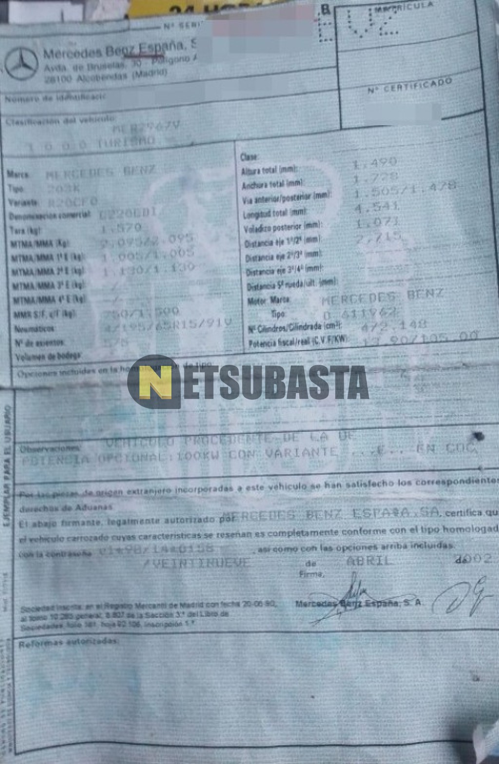 Subasta de Mercedes-Benz C 220 CDI Familiar Aut. 2002 Averiados, Marca Mercedes-Benz, Modelo C 220 CDI Familiar Aut., Combustible Diésel, Kilometraje 355.000 KM, Fecha 1ª matriculación 05/2002, Matrícula ****BVZ, Color Exterior , Color Interior , IVA REBU y Ubicación Cáceres.