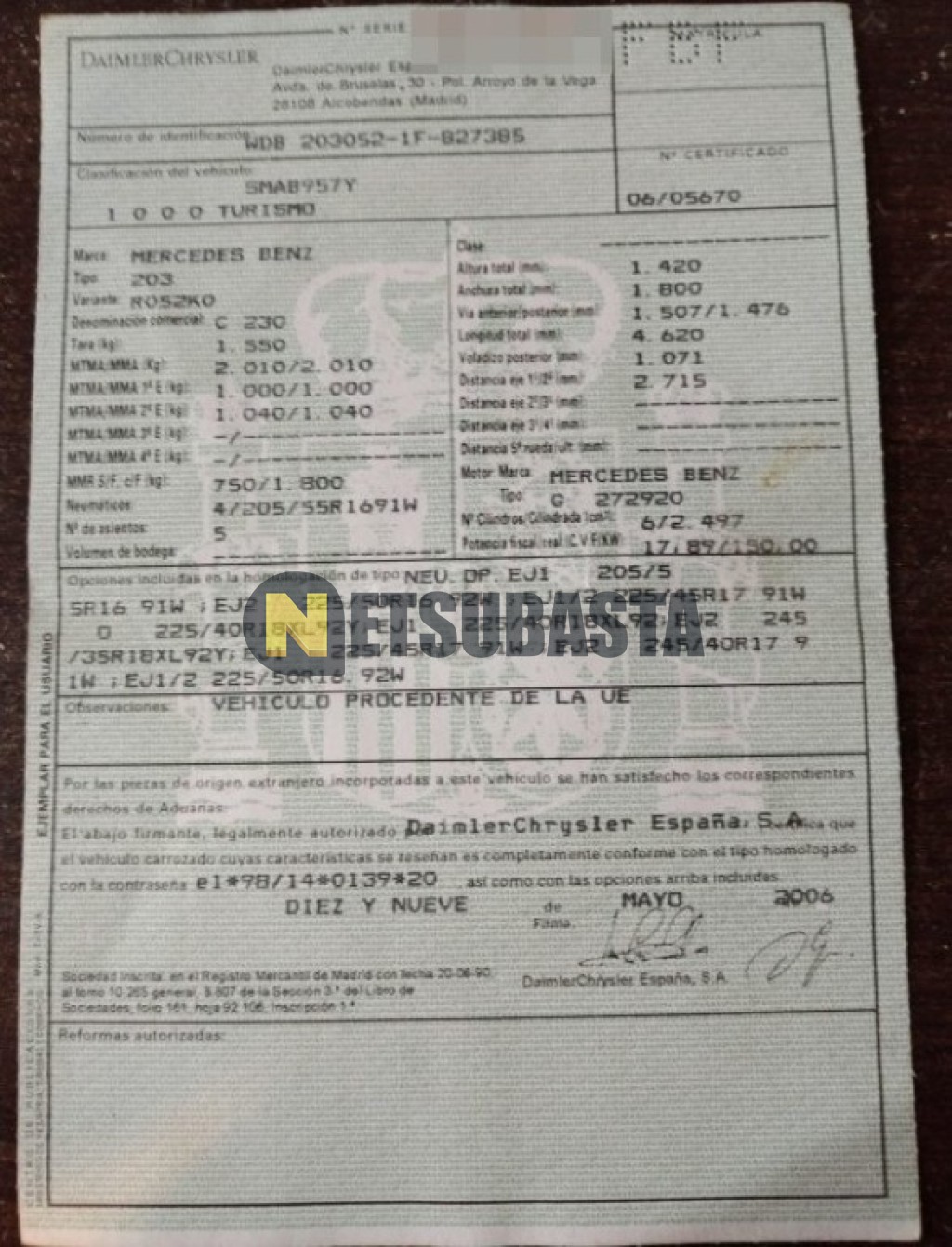 Subasta de Mercedes-Benz C 230 Aut. 2006 Averiados, Marca Mercedes-Benz, Modelo C 230 Aut., Combustible Gasolina, Kilometraje 125.000 KM, Fecha 1ª matriculación 06/2006, Matrícula ****FBF, Color Exterior , Color Interior , IVA REBU y Ubicación Toledo.