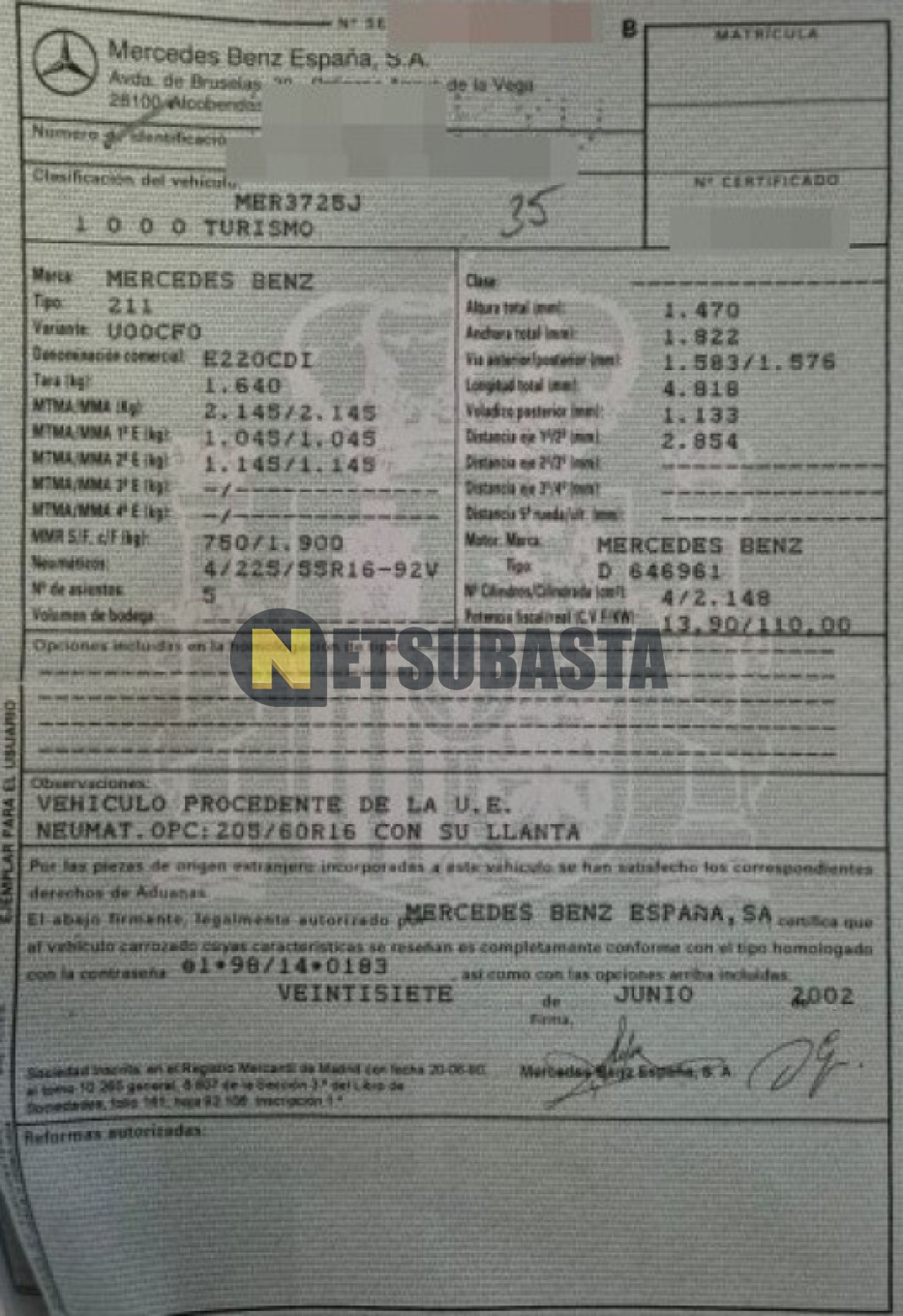 Recuerde que si lo desea, puede imprimir la ficha del vehículo Mercedes-Benz E 220 CDI Aut. 2002 con todas sus características técnicas.
