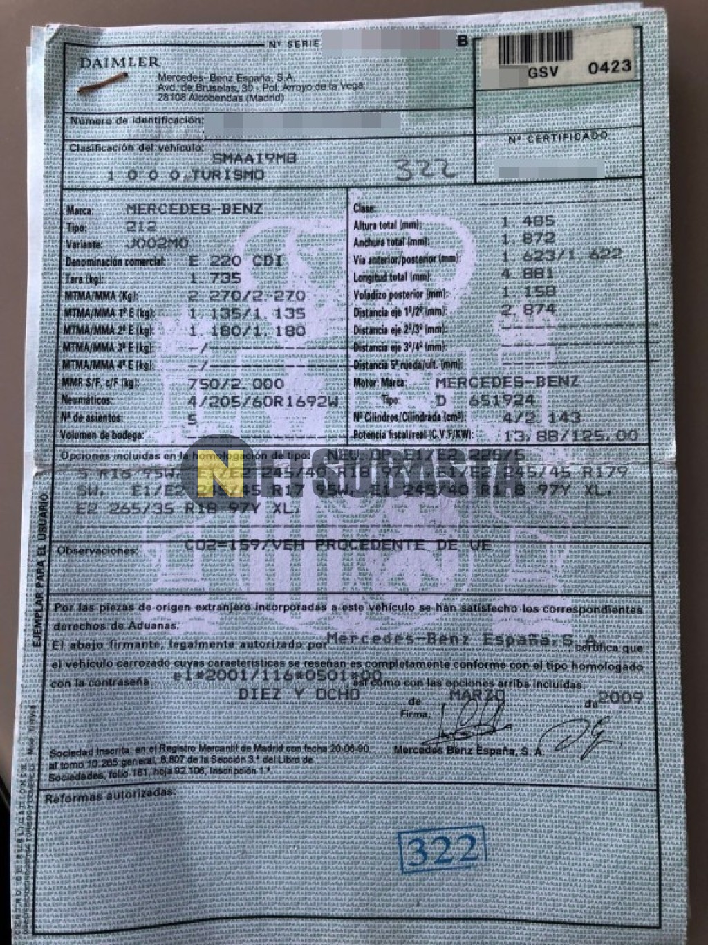 Subasta de Mercedes-Benz E 220 CDI BlueEFFICIENCY Aut. 2010 Averiados, Marca Mercedes-Benz, Modelo E 220 CDI BlueEFFICIENCY Aut., Combustible Diésel, Kilometraje 372.000 KM, Fecha 1ª matriculación 01/2010, Matrícula ****GSV, Color Exterior , Color Interior , IVA REBU y Ubicación Málaga.