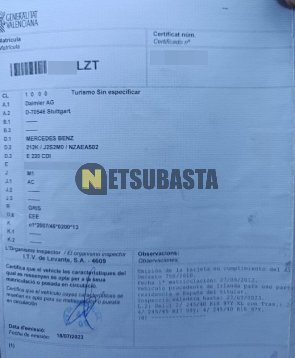 Subasta de Mercedes-Benz E 220 CDI BlueEFFICIENCY Estate Aut. 2012 Averiados, Marca Mercedes-Benz, Modelo E 220 CDI BlueEFFICIENCY Estate Aut., Combustible Diésel, Kilometraje 245.000 KM, Fecha 1ª matriculación 09/2012, Matrícula ****LZT, Color Exterior , Color Interior , IVA REBU y Ubicación Valencia.