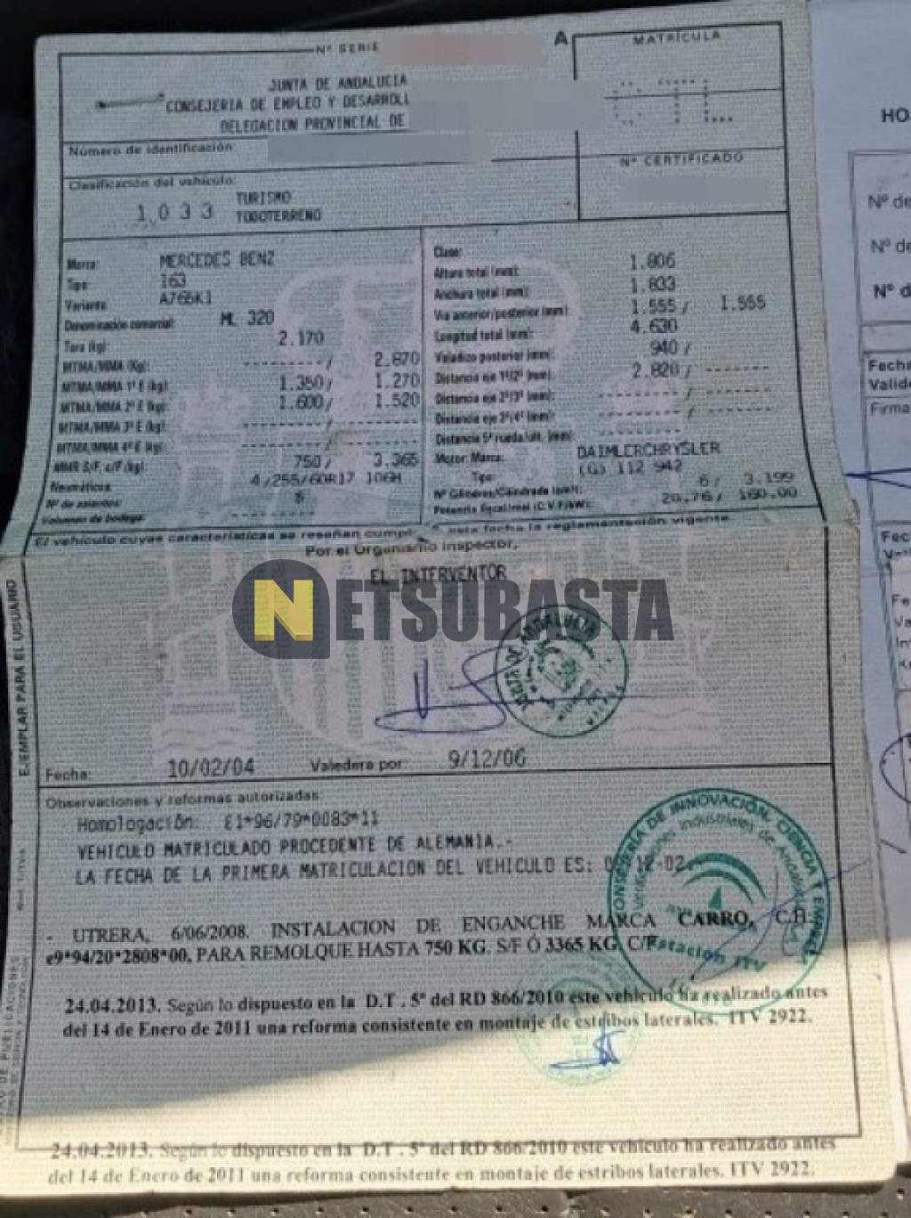 Subasta de Mercedes-Benz ML 320 2002 Averiados, Marca Mercedes-Benz, Modelo ML 320, Combustible Gasolina, Kilometraje 338.000 KM, Fecha 1ª matriculación 12/2002, Matrícula ****CTL, Color Exterior , Color Interior , IVA REBU y Ubicación Málaga.