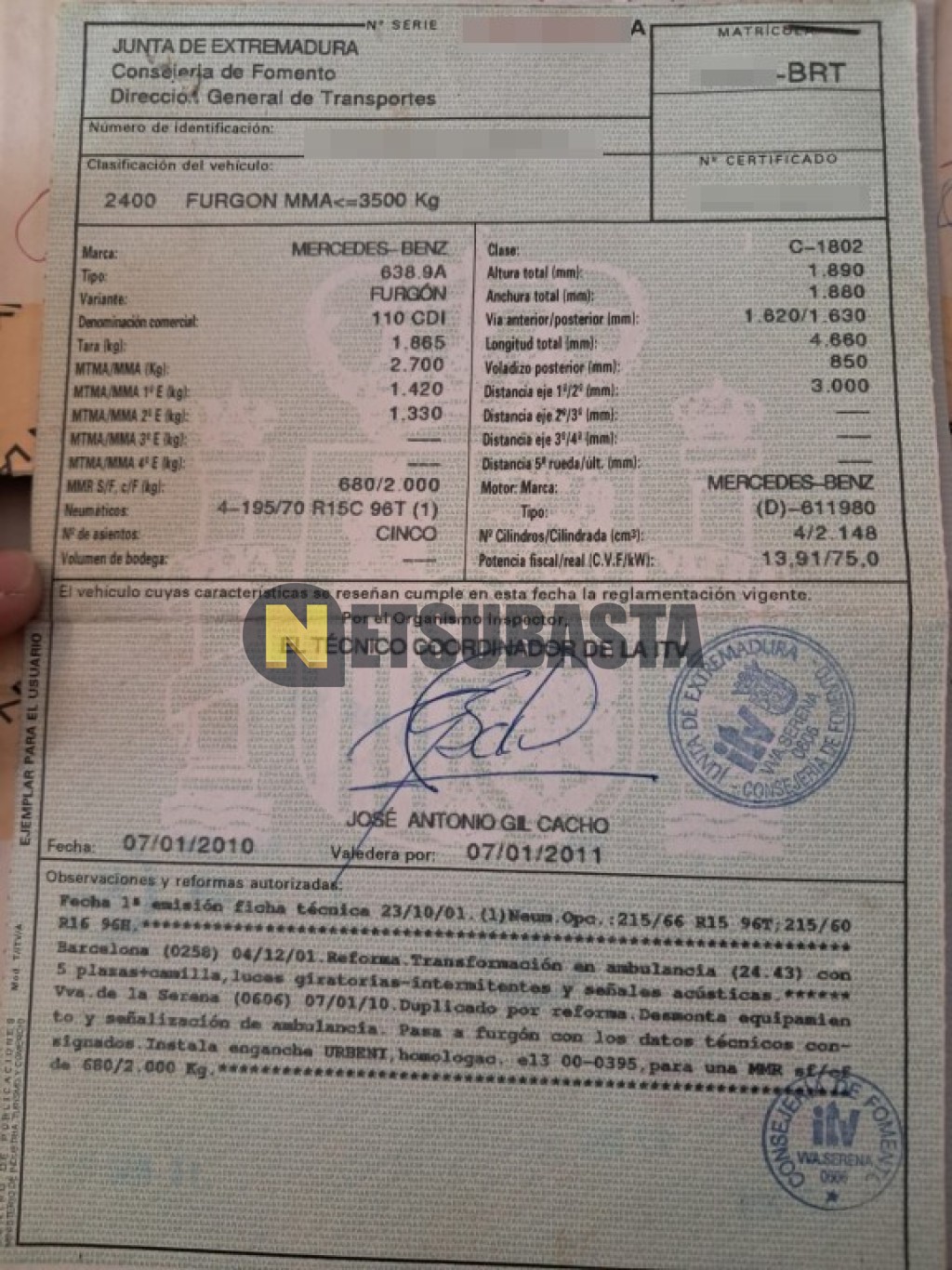 Subasta de Mercedes-Benz Vito 110 CDI 2002 Averiados, Marca Mercedes-Benz, Modelo Vito 110 CDI, Combustible Diésel, Kilometraje 115.000 KM, Fecha 1ª matriculación 01/2002, Matrícula ****BRT, Color Exterior , Color Interior , IVA REBU y Ubicación Badajoz.