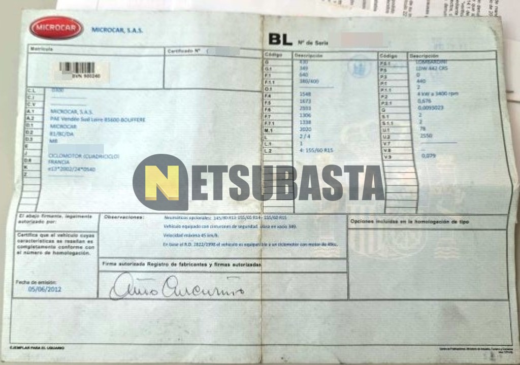 Subasta de Microcar M8 2012 Siniestrados, Marca Microcar, Modelo M8, Combustible Diésel, Kilometraje 25.000 KM, Fecha 1ª matriculación 06/2012, Matrícula C****BVN, Color Exterior , Color Interior , IVA REBU y Ubicación Islas Baleares.