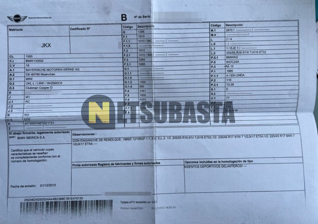 Subasta de Mini Cooper D Clubman 2015 Averiados, Marca Mini, Modelo Cooper D Clubman, Combustible Diésel, Kilometraje 227.000 KM, Fecha 1ª matriculación 12/2015, Matrícula ****JKX, Color Exterior , Color Interior , IVA REBU y Ubicación Málaga.