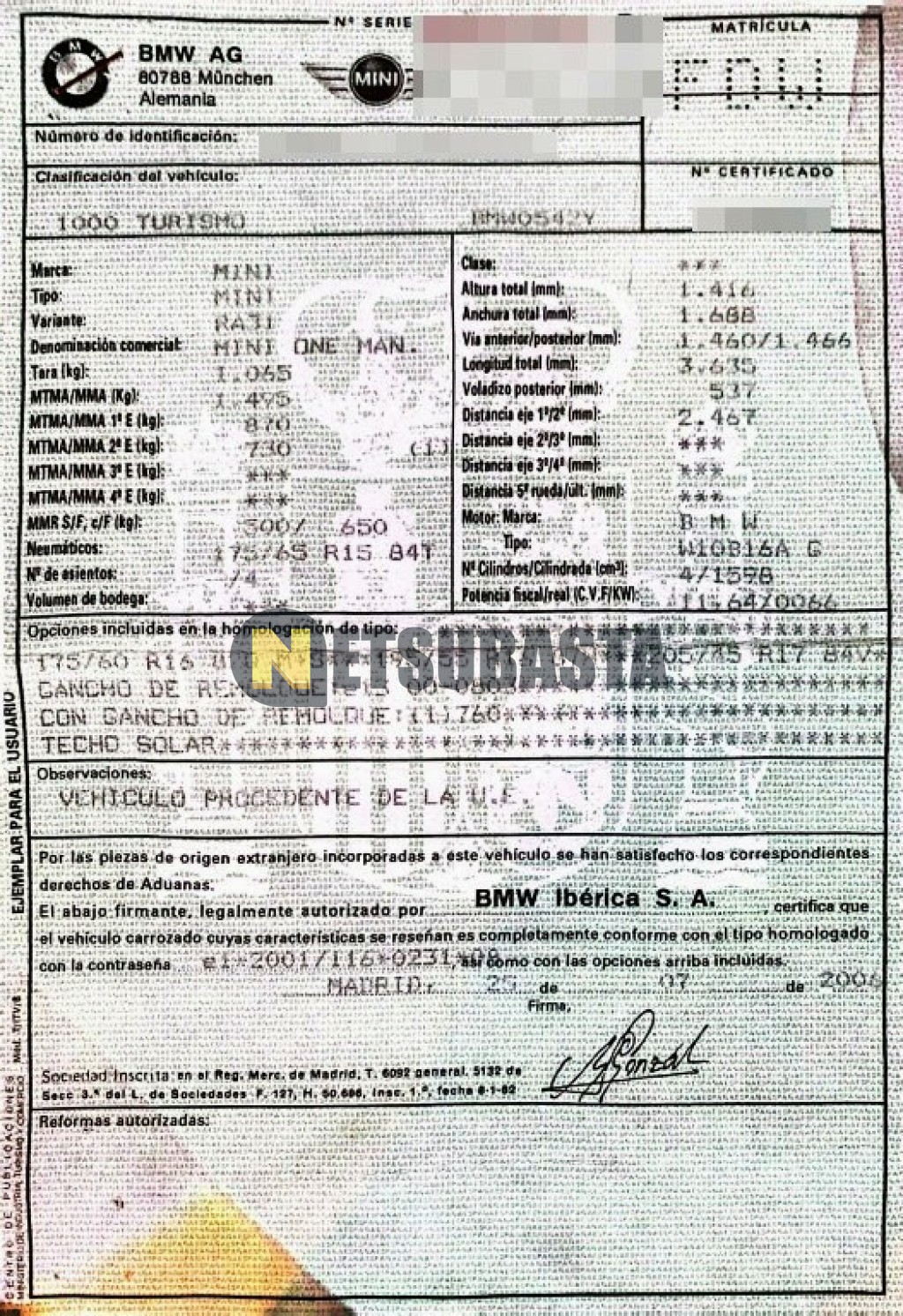 Subasta de Mini One 2006 Averiados, Marca Mini, Modelo One, Combustible Gasolina, Kilometraje 200.000 KM, Fecha 1ª matriculación 08/2006, Matrícula ****FDW, Color Exterior , Color Interior , IVA REBU y Ubicación Cádiz.