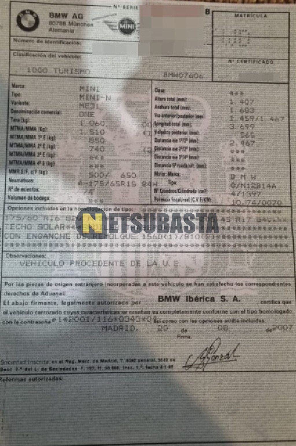 Subasta de Mini One 2007 Averiados, Marca Mini, Modelo One, Combustible Gasolina, Kilometraje 177.000 KM, Fecha 1ª matriculación 10/2007, Matrícula ****FWD, Color Exterior , Color Interior , IVA REBU y Ubicación Islas Baleares.