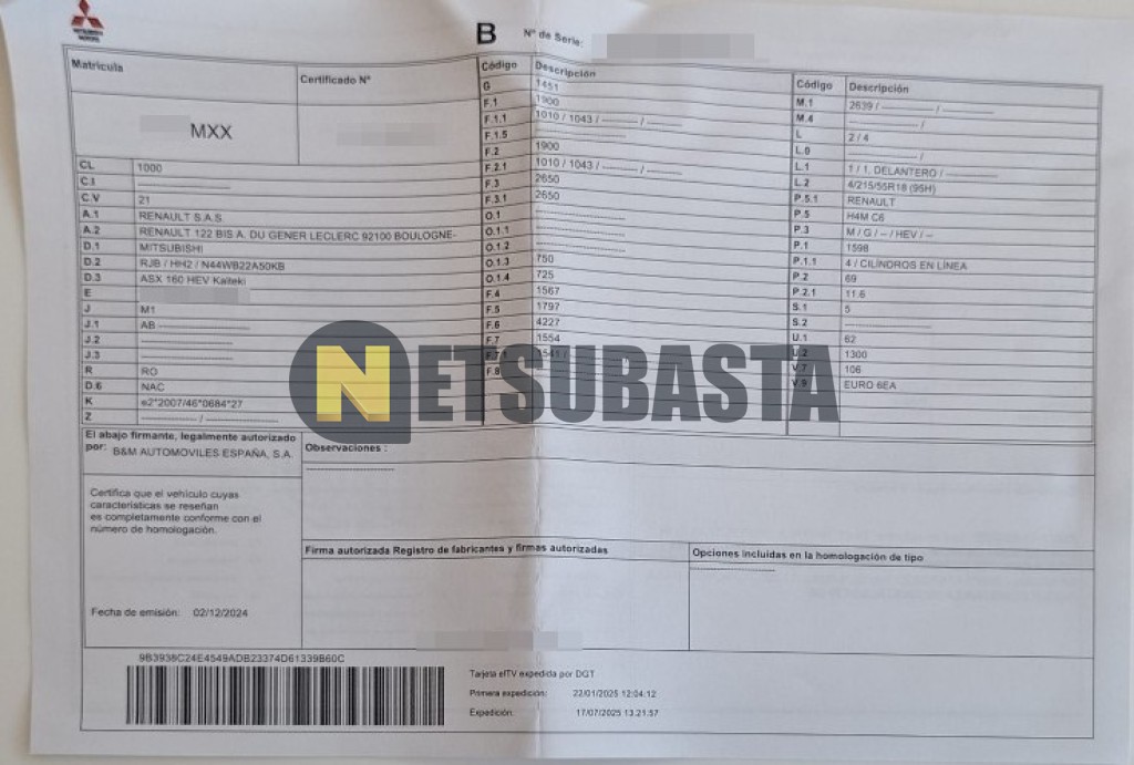 Subasta de Mitsubishi ASX 160 HEV 2025 Siniestrados, Marca Mitsubishi, Modelo ASX 160 HEV , Combustible Híbrido (Electro/Gasolina), Kilometraje 3.000 KM, Fecha 1ª matriculación 01/2025, Matrícula ****MXX, Color Exterior , Color Interior , IVA IVA Deducible y Ubicación Madrid.