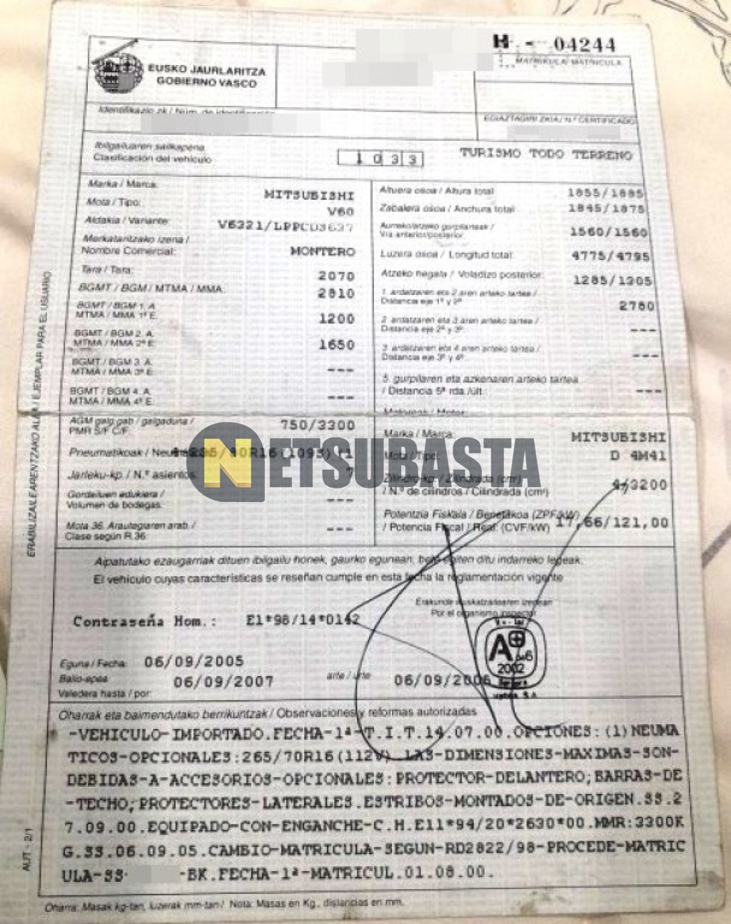 Subasta de Mitsubishi Montero 3.2 DI-D 2000 Averiados, Marca Mitsubishi, Modelo Montero 3.2 DI-D , Combustible Diésel, Kilometraje 330.000 KM, Fecha 1ª matriculación 08/2000, Matrícula ****DRW, Color Exterior , Color Interior , IVA REBU y Ubicación Burgos.